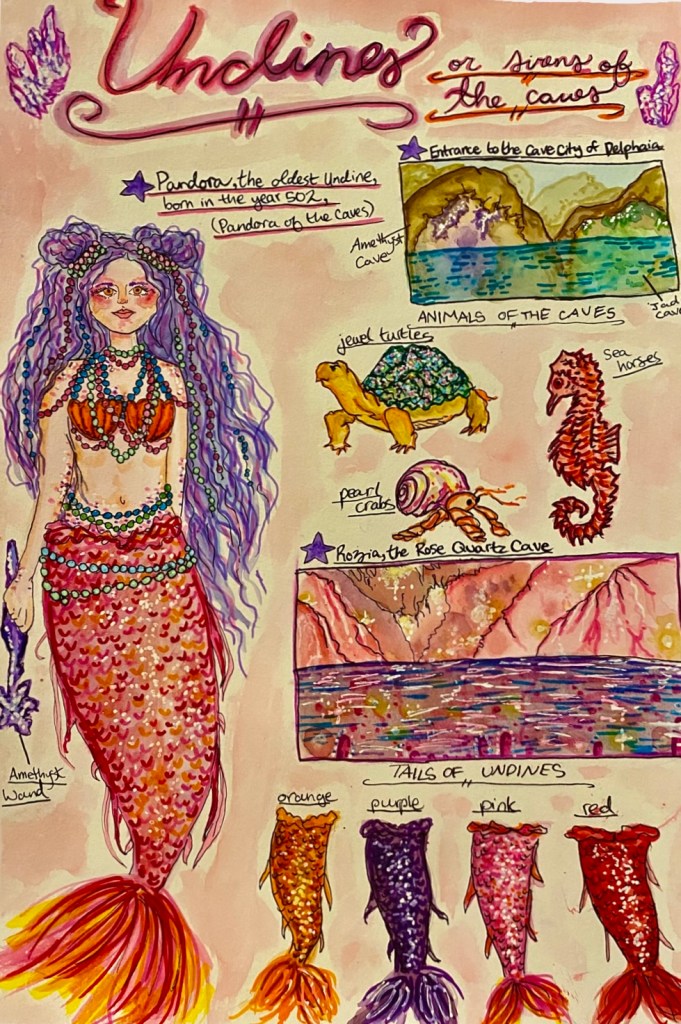 Sirens of the caves are known as Undines. Undines are ethereal and mystical sirens who live within crystal filled caves as they are drawn to the colourful and sparkly. They also enjoy the warmth of the cave waters. Undines thrive anywhere that there are caves, shallow warm waters, and sparkly crystals, shells, and pearls. Undines mostly live in a city built into a network of crystal caves, called the Cave City of Delphaia. Delphaia has a cave of rose quartz, a cave of amethyst, a cave of jade, a cave of citrine, a cave of moonstone, and a cave of lapis.