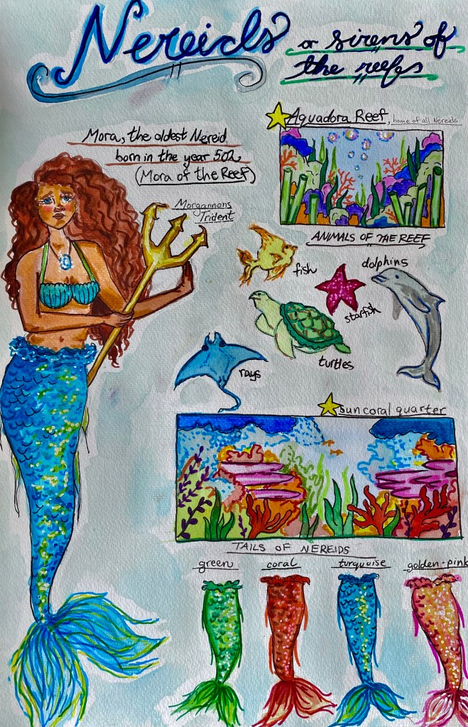 Nereids often have tails of green, coral, turquoise, and golden pink, with many variations of all these shades making the Nereids the most colourful sirens of the sea. Nereids often befriend stingrays, varieties of fish, turtles, and dolphins; who love to hang around the reef. Nereids are known for their resilience, being the only group of sirens without an ancient leader, many in their community feel a sense of unfairness around the mystery of Mora, the lost siren.
