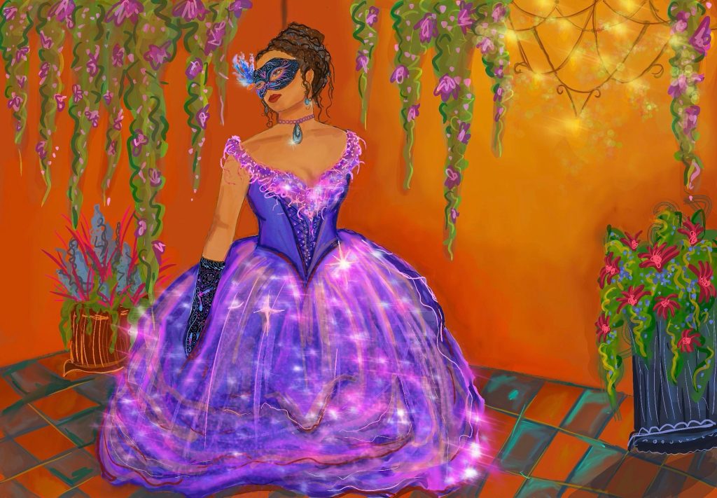 This is a digital sketch from a later scene in Project Sea Witch, an image of my main female character, Caspia, attending a masked ball.