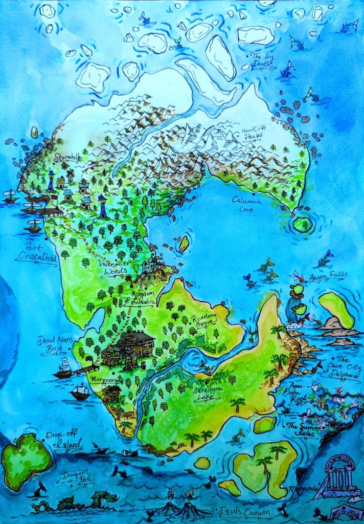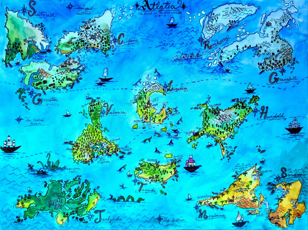 This is a watercolour map of Atlatia, the world my fantasy series takes place in. Atlatia is a land of twelve isles, and four realms, each with their own unique history, magic, and folklore.