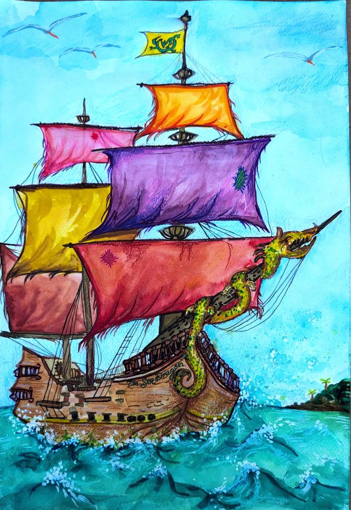 This is a watercolour illustration of The Sea Dragon, the pirate ship in my story.