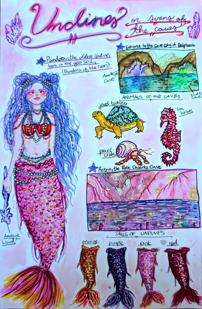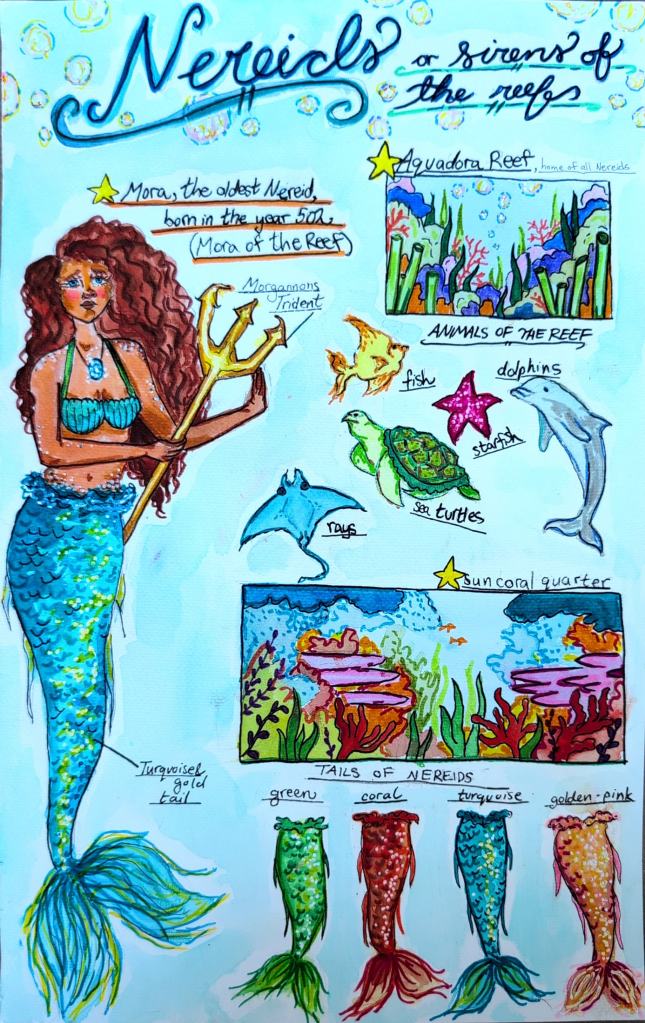 This is a watercolour image from a series I call ‘Siren Science’, a collection of profiles on different kinds of mermaids in the world of Atlatia. This image is a diagram of a ‘Nereid’, a mermaid who lives on the coral reef.