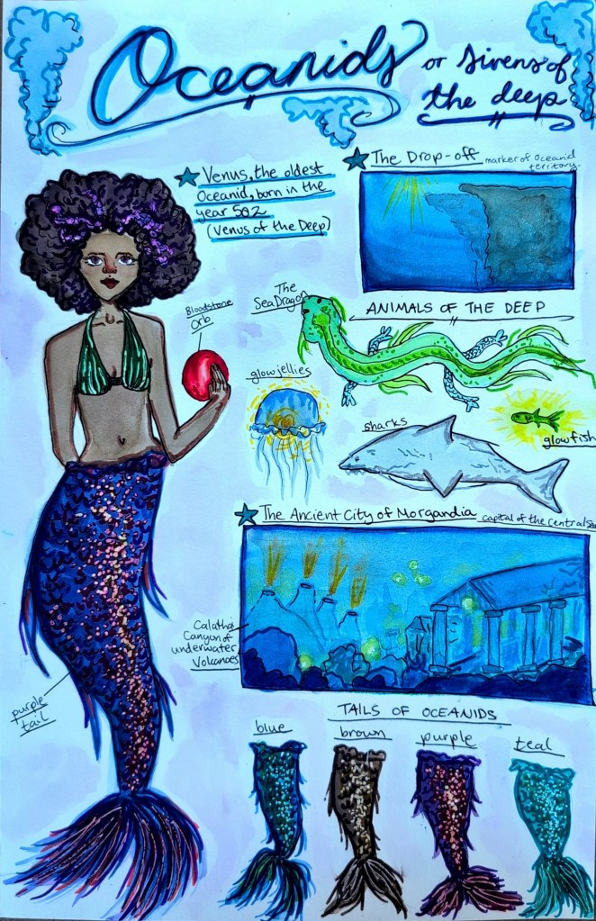 This is another watercolour profile from ‘Siren Science’. This diagram is of an ‘Oceanid’, a deep sea siren who lives in the cavernous depths of the ocean.