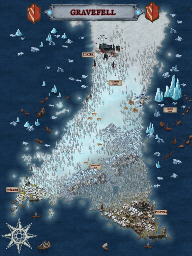 Last is Gravefell. The island of Gravefell is divided into two parts, the human city of Vultura, which is protected by a tall swath pf rocky mountains; and the Vampyre city of Ilkisk. Gravefell also boasts a small witch town called HΓ«lken. Most of the Ice Realm is impossible to get to by boat since it is surrounded by so many icebergs and glaciers.