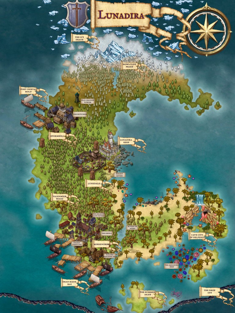 This is Lunadira, the main setting of my first story. Lunadira is made unique by its crescent moon shape, and its coasts that embody the extremes of Summer and Winter. It is also home to ancient crystal caves, and a massive coral reef, rumoured to have sirens swimming within.