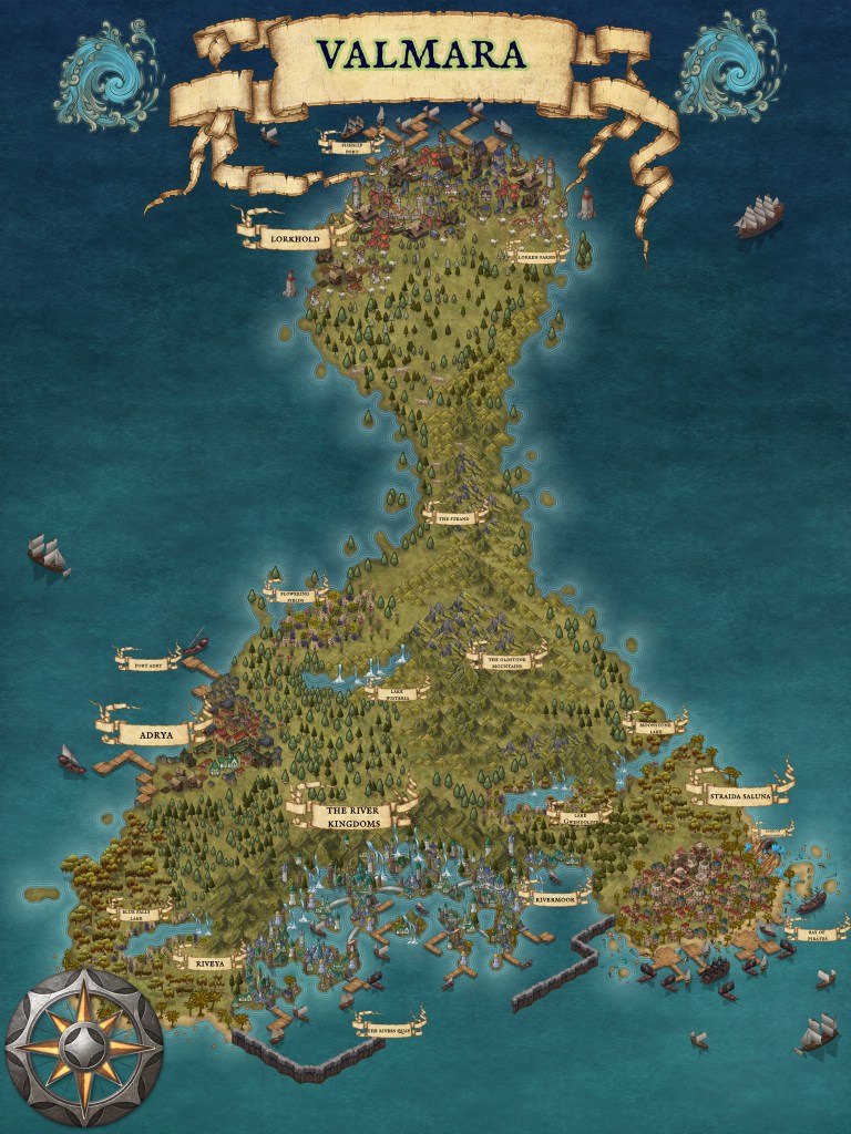 This is Valmara, the Isle South West of Lunadira, the Isle known for its twin cities of mountains, rivers, and waterfalls; The River Kingdoms of Valmara. The Isle is known for its vast green space and beautiful mountains and lakes.